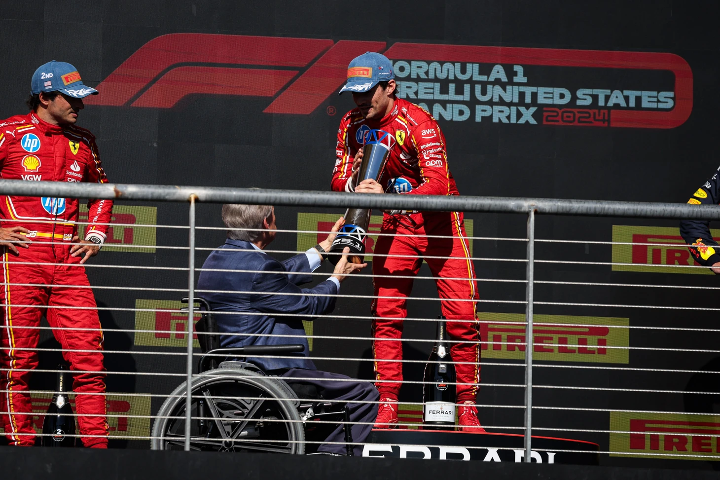 Вместо этого победитель – пилот «Феррари» Шарль Леклер – получил приз в виде более традиционного кубка, а призеры – его напарник Карлос Сайнс и гонщик «Ред Булл» Макс Ферстаппен – шины для аэротрубы, на гайках которых выгравированы финишные позиции и флаг США.