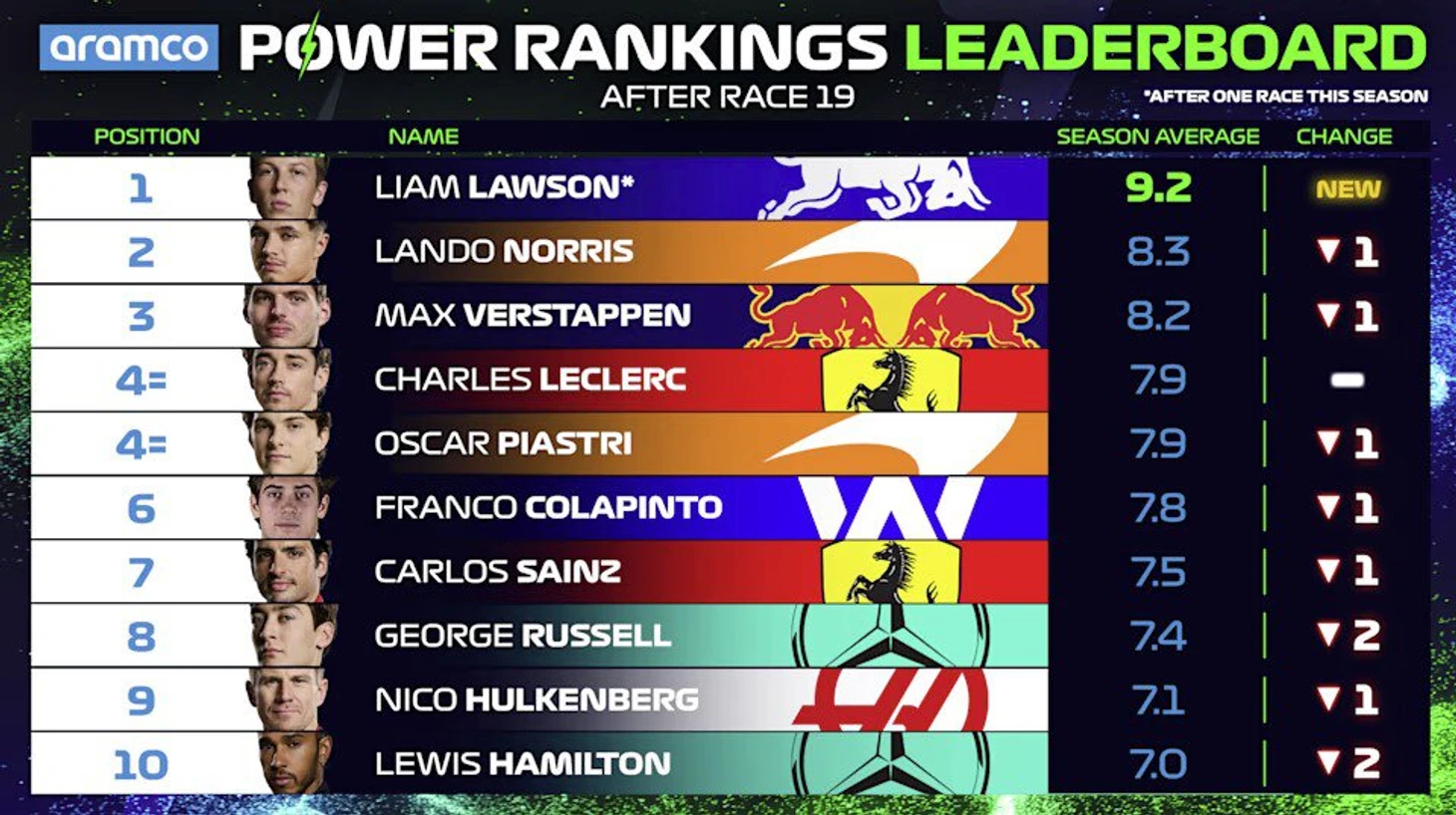 В общем зачете рейтинга на первое место временно вышел Лиам Лоусон, который успел провести всего один Гран-при. Далее располагаются Ландо Норрис, Макс Ферстаппен, Шарль Леклер и Оскар Пиастри.