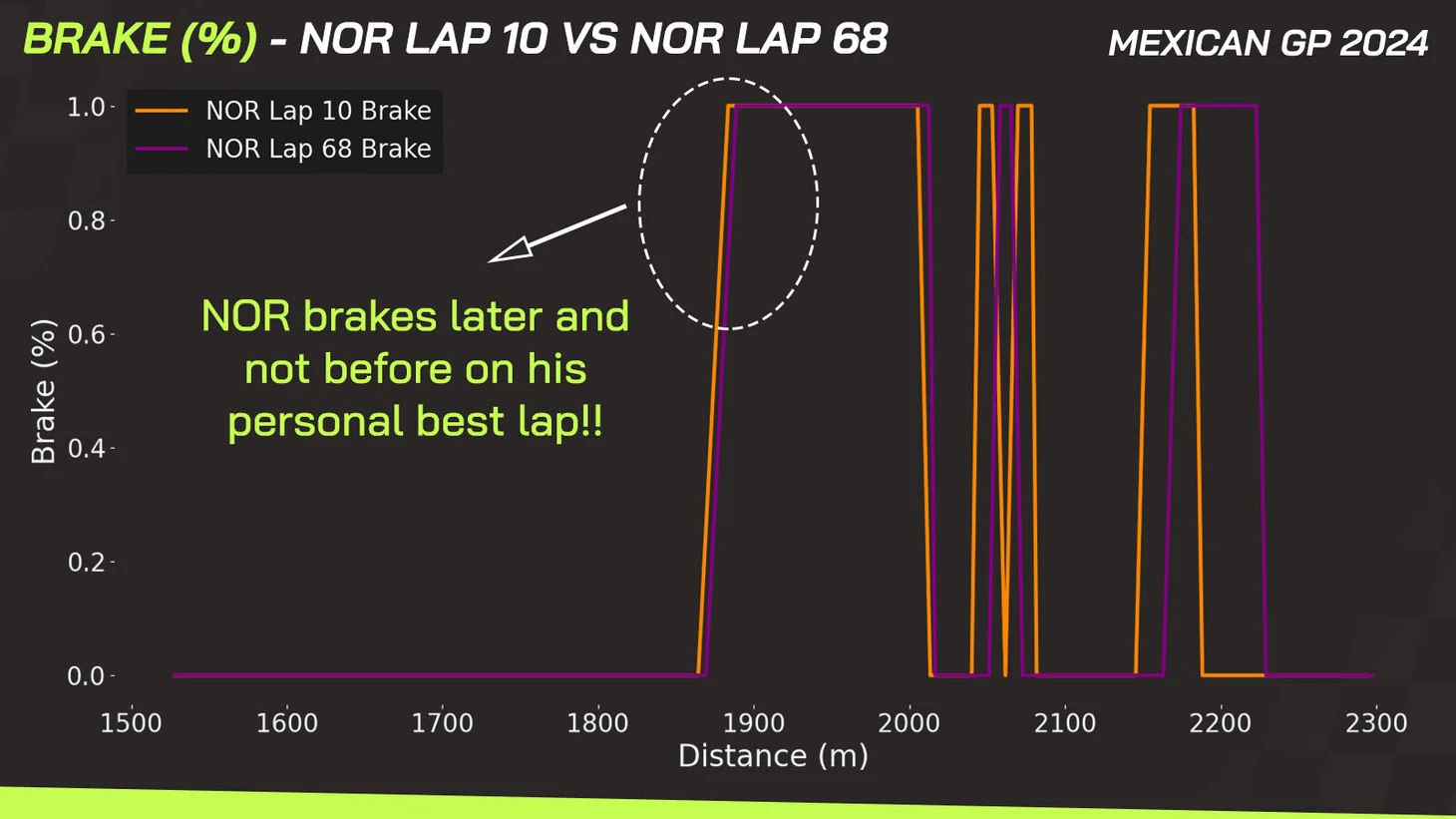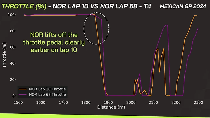 На десятом круге Норрис начал отпускать педаль газа существенно раньше, хоть и делал это более плавно, чтобы оказаться первым на апексе.