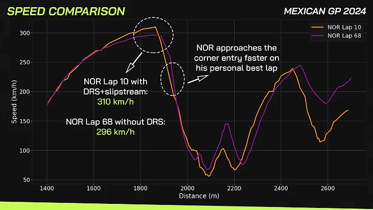 Портал PlanetF1 выложил графики скорости и работы с педалями газа и тормоза. На десятом круге, когда случился спорный эпизод, Норрис действительно был на 14 км/ч быстрее, чем на 68-м (лучшем). Однако Хорнер не упомянул, что в первом случае британец воспользовался DRS и слипстримом, а во втором ехал в чистом воздухе.