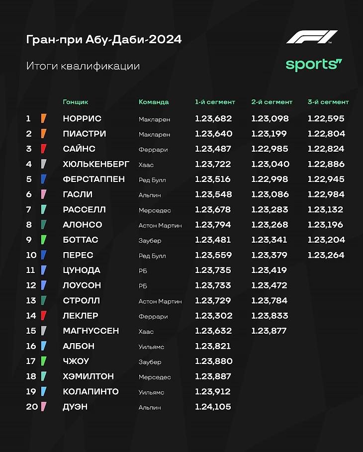 Завершилась квалификация к заключительной, 24-й гонке «Формулы-1» сезона-2024 – Гран-при Абу-Даби.