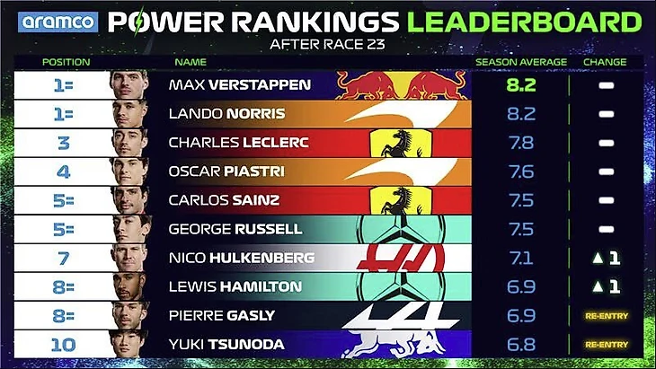 В общем зачете рейтинга Макс Ферстаппен догнал Ландо Норриса и гонщики делят первое место со средней оценкой 8,2 балла