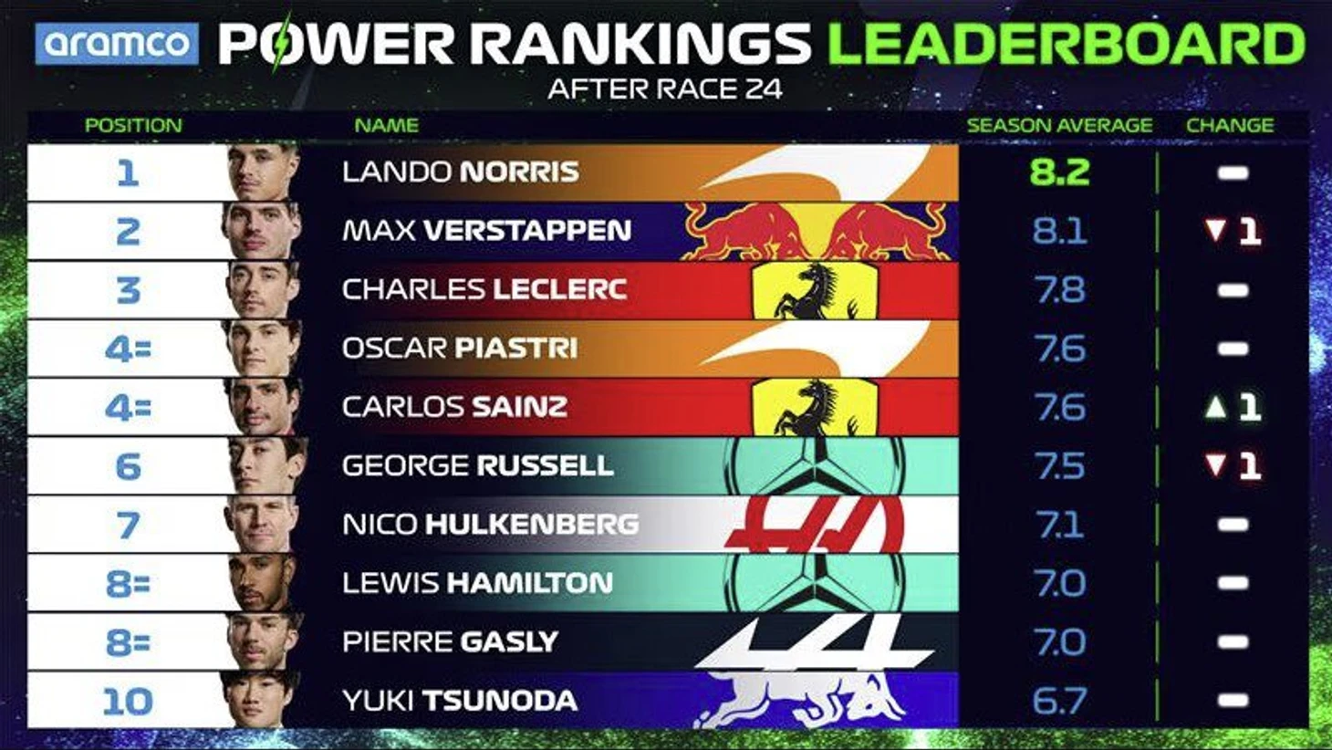 В общем зачете рейтинга лучшим гонщиком сезона, по средней оценке, стал Ландо Норрис. Он опередил Макса Ферстаппена на 0,1 балла