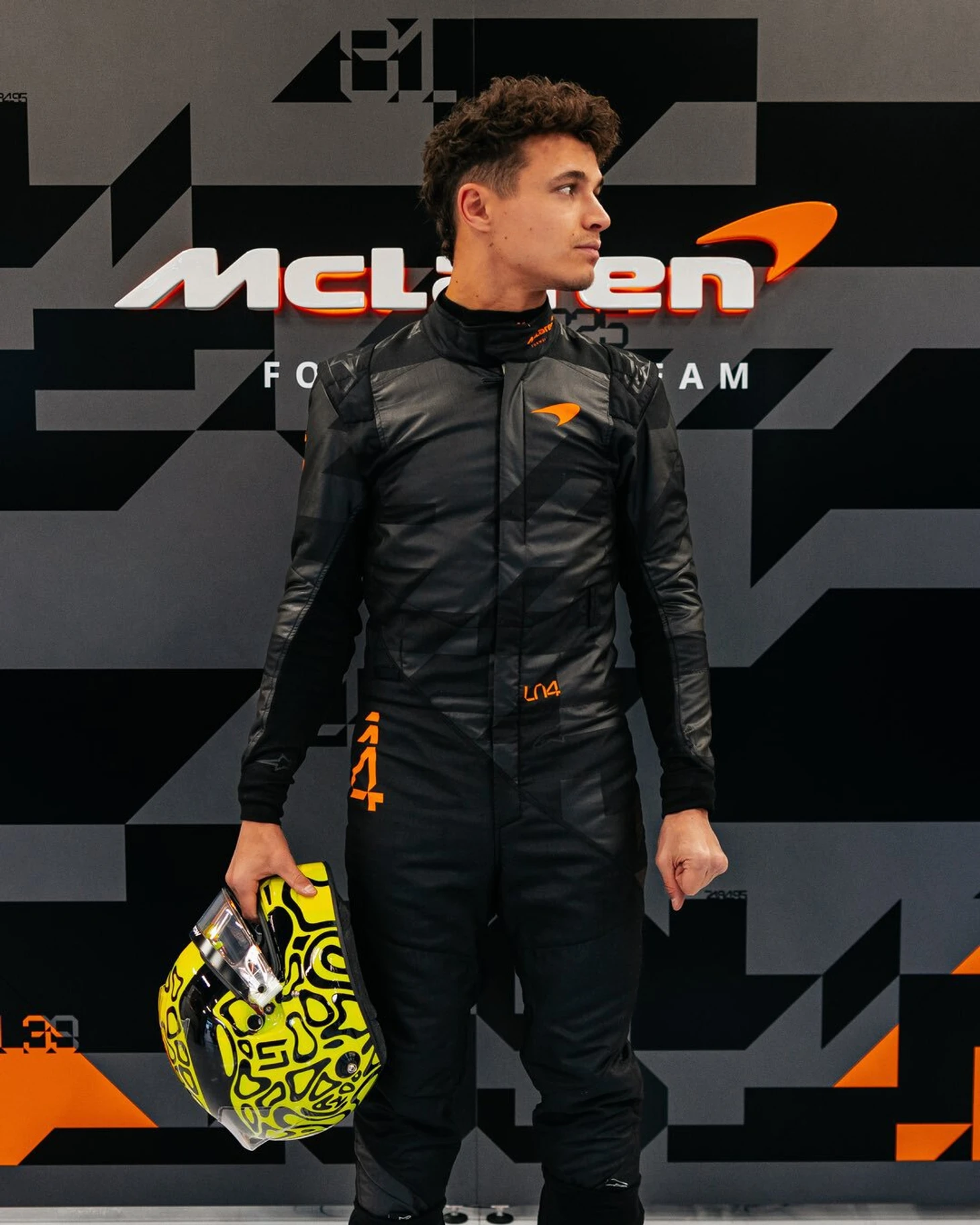 Ландо Норрис примерил черную форму с номером и логотипом цвета папайи.