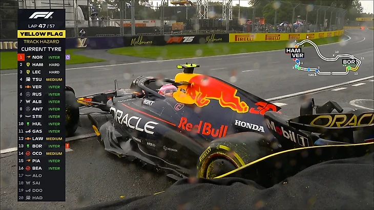 Гонщики «Ред Булл» и «Заубера» попали в аварии на одном круге – оба не справились с управлением после возобновления дождя. Инциденты произошли на 47 круге гонки.