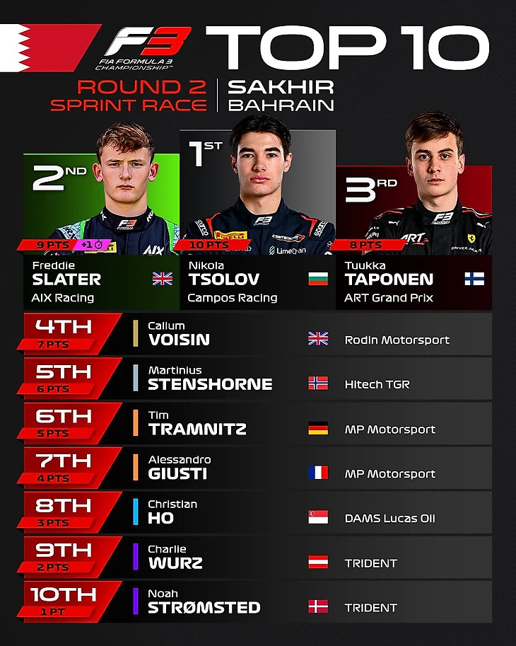 Формула-3. Бахрейн. Цолов выиграл спринт, Слэйтер – 2-й в дебютной гонке, лидер сезона Камара – 12-й