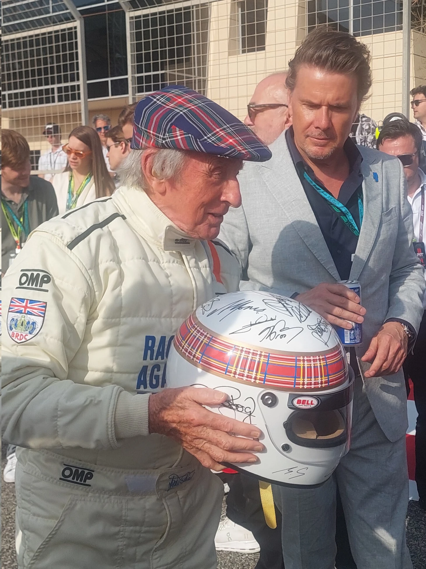 85-летний Джеки Стюарт провел демонстрационные заезды в шлеме, подписанном 20 чемпионами «Ф-1», в поддержку борьбы с деменцией