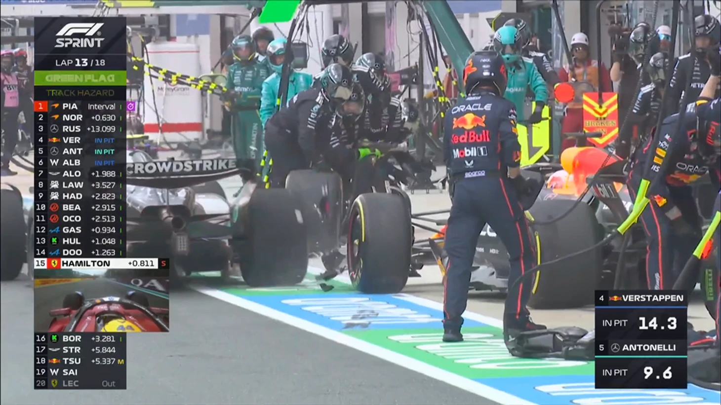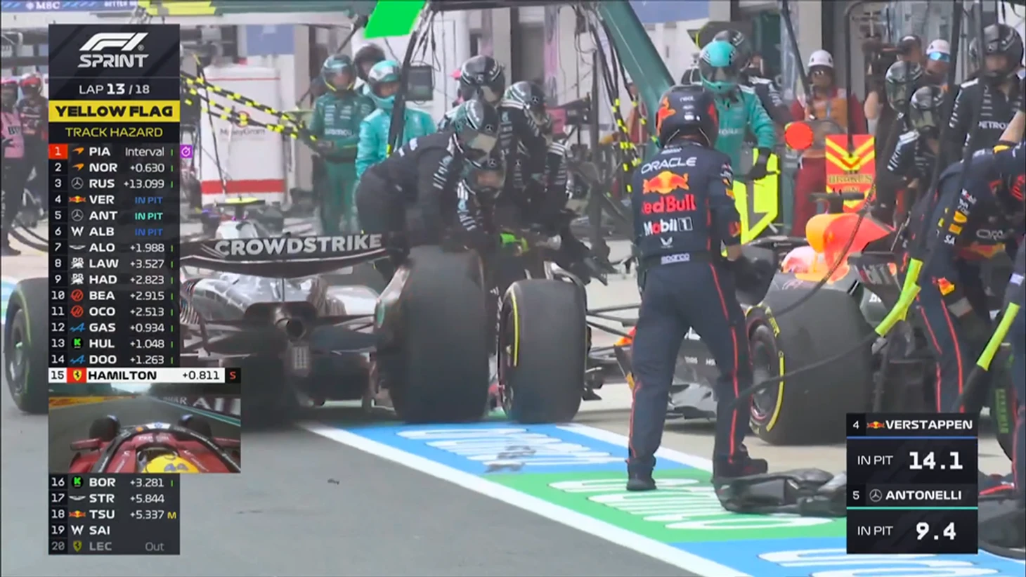 Ферстаппена невовремя выпустили с пит-стопа и он врезался в болид Андреа Кими Антонелли, который как раз проезжал мимо, заезжая на свое место для проведения пит-стопа. В результате переднее антикрыло на болиде Ферстаппена было повреждено, но Макс продолжил заезд.