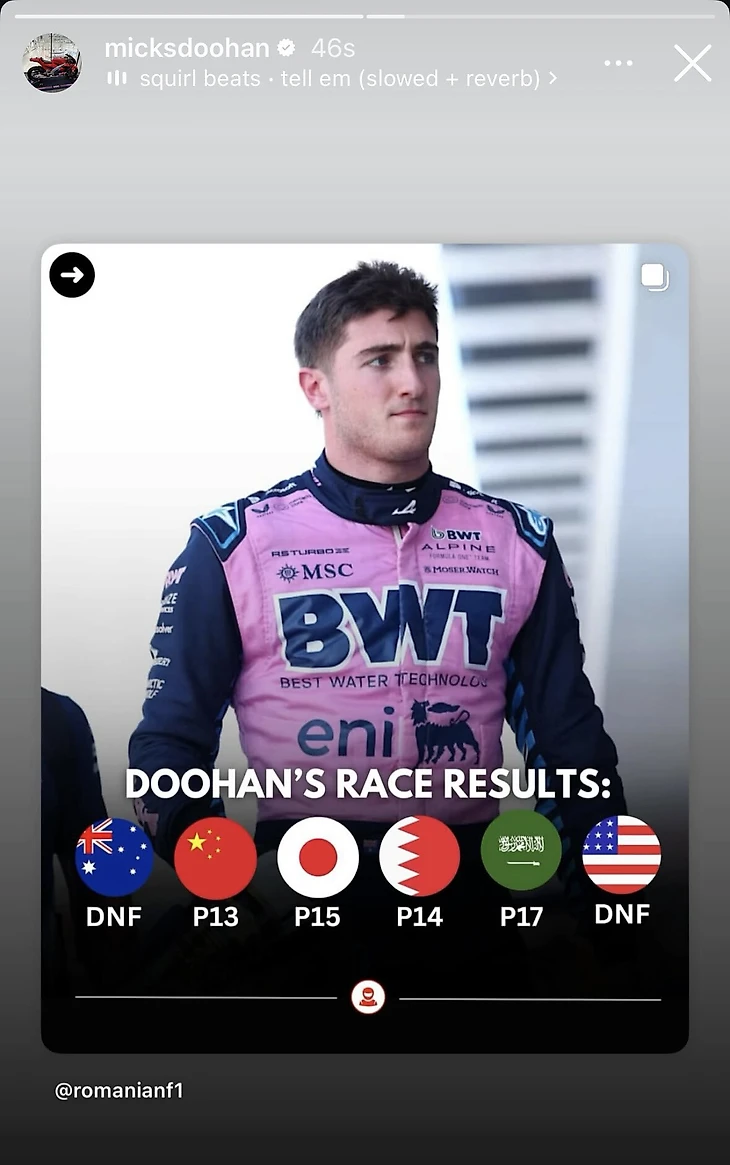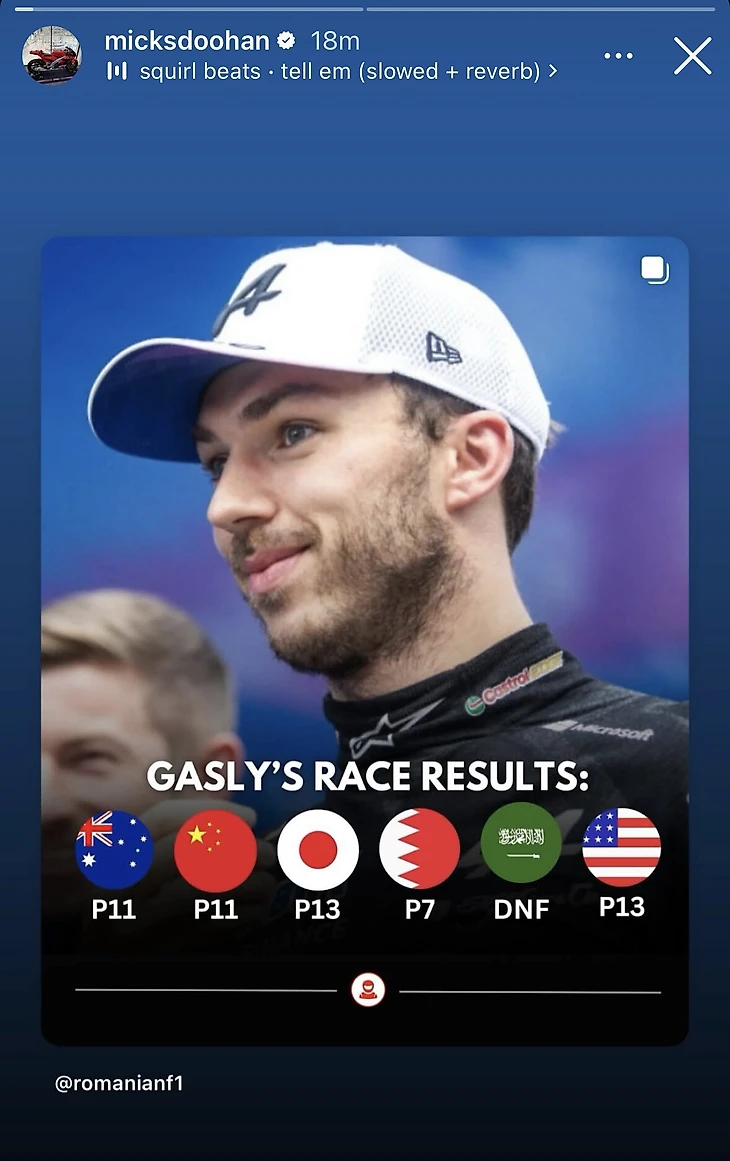 Мик опубликовал инфографику с результатами Пьера Гасли и своего сына без комментариев. Француз попал в очки в основной гонке в Бахрейне, заняв седьмое место, а также в спринте в Майами, где стал восьмым. На счету Дуэна ноль баллов. В США новичок «Формулы-1» переквалифицировал опытного напарника, но сошел в гонке после контакта с Лиамом Лоусоном из «Рейсинг Буллз».