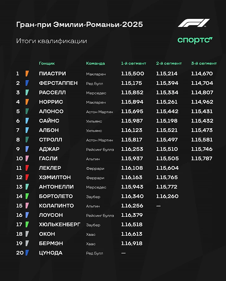 Гран-при Эмилии-Романьи-2025. Пиастри выиграл квалификацию, Ферстаппен – 2-й, Расселл – 3-й