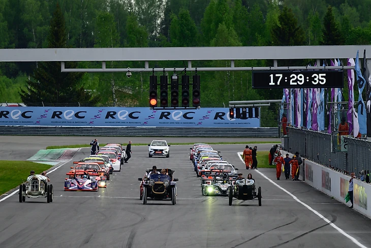 Стартовая процедура превратилась в театрализованное представление от команды снимающегося художественного фильма «Битва моторов», когда на трек выехали копии автомобилей начала 20-го века.