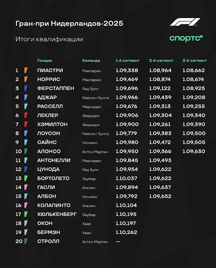 Гран-при Нидерландов-2025. Пиастри выиграл квалификацию, Норрис – 2-й, Ферстаппен – 3-й