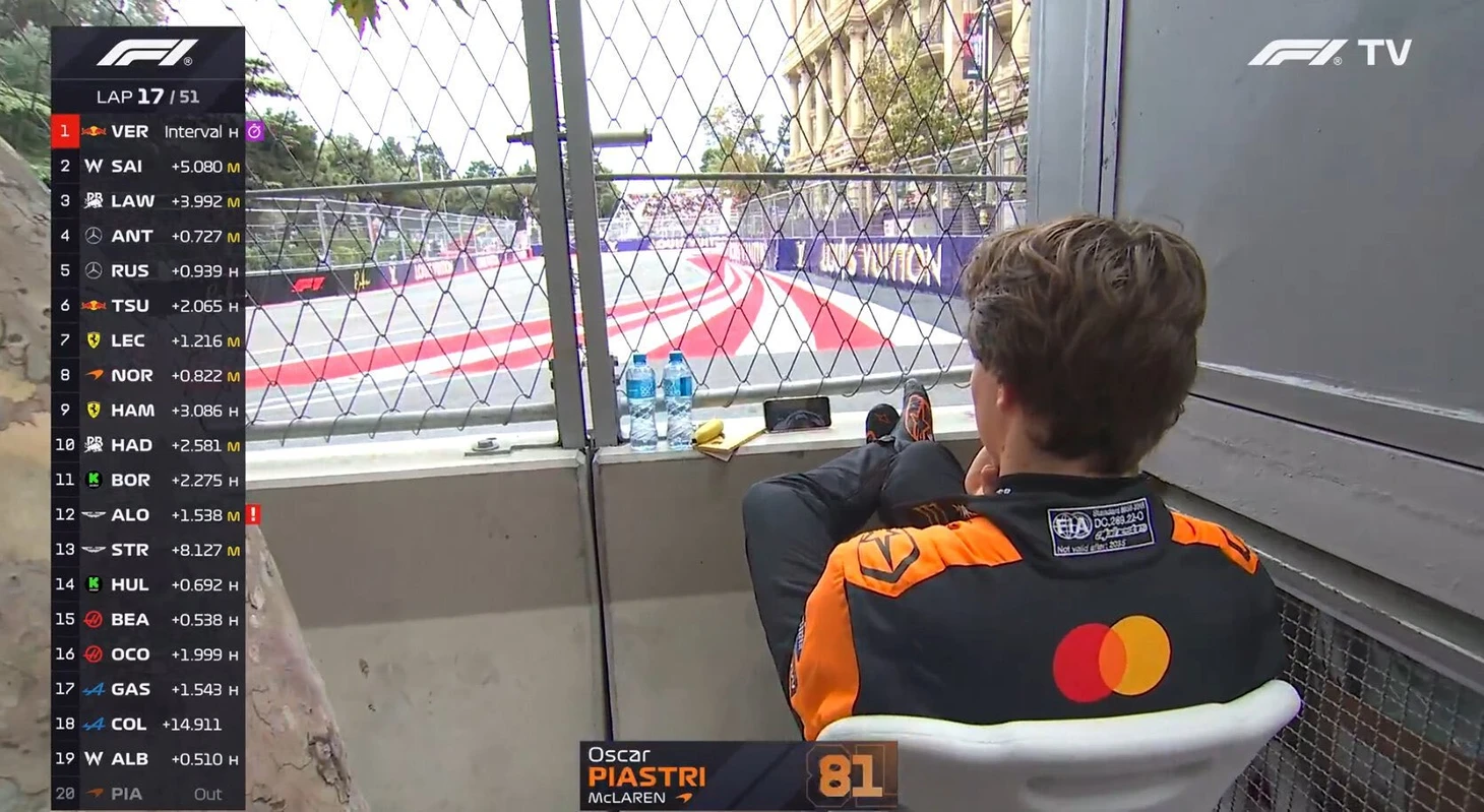 Пилот «Макларена» Оскар Пиастри наблюдает за коллегами, которые продолжают соревноваться на Гран-при Азербайджана.