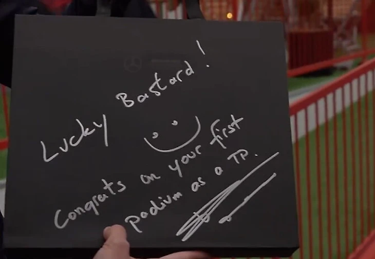 На пакете шеф «Мерседеса» Тото Вольфф написал: «Везучий ублюдок!»
