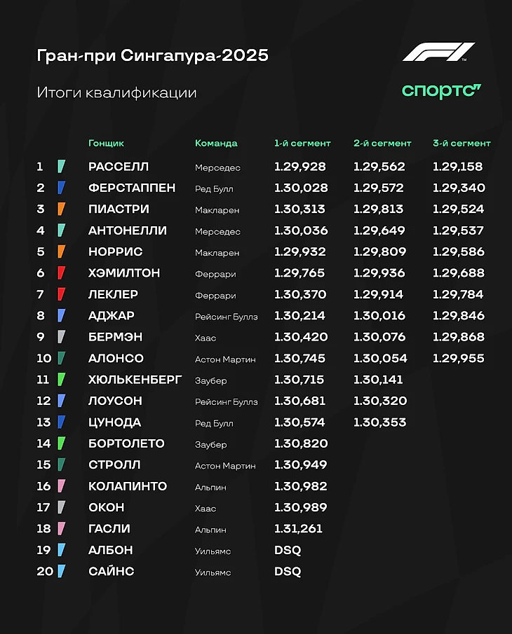 Гран-при Сингапура-2025. Расселл выиграл квалификацию, Ферстаппен – 2-й, Пиастри – 3-й