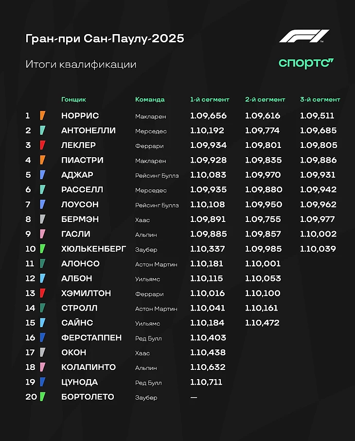 Гран-при Сан-Паулу-2025. Норрис выиграл квалификацию, Антонелли – 2-й, Леклер – 3-й, Пиастри – 4-й, Ферстаппен – 16-й
