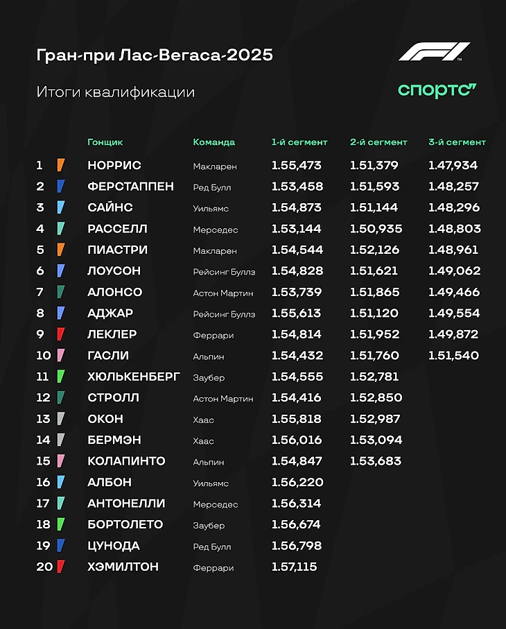 Гран-при Лас-Вегаса-2025. Норрис выиграл дождевую квалификацию, Ферстаппен – 2-й, Сайнс – 3-й, Пиастри – 5-й
