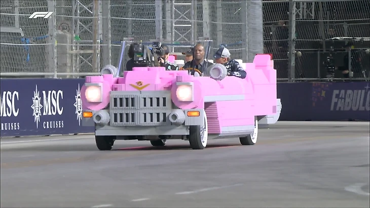 Актер Терри Крюс довез пилотов «Ф-1» до подиума Гран-при Лас-Вегаса на «Кадиллаке» из Lego