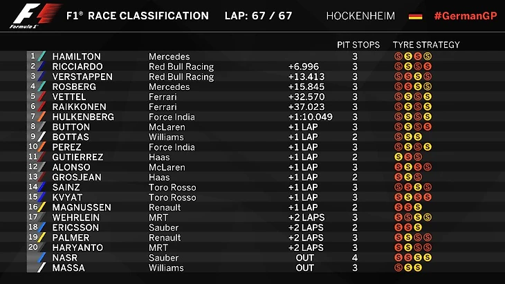 ПК-Росберг(5) ЛК-Хэмильтон НП-Грожан(5) 1-Хэмильтон(10) 2-Росберг 3-Феттель 4-Риккьярдо 5-Ферстапен 6-Райкконен(10) 7-Боттас 8-Хюлькенберг(5) 9-Баттон(5) 10-Сайнс