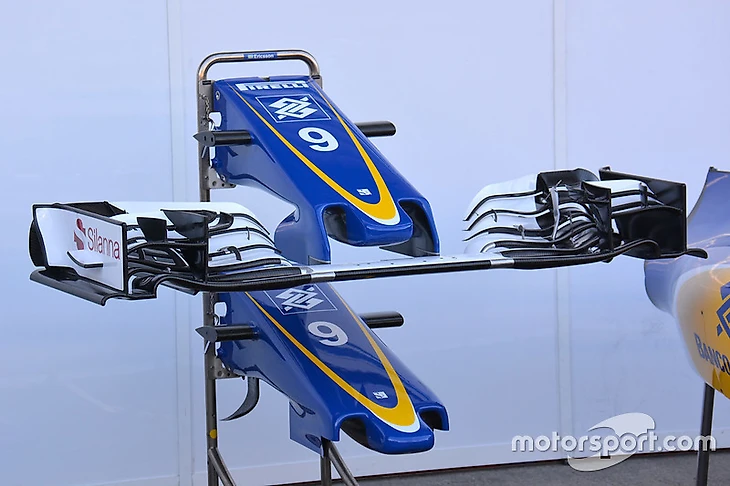 При изучении переднего крыла явно ощущается влияние философии «Ред Булл». Изменения, если сравнивать с прежней версией, коснулись едва ли не каждой поверхности. Сейчас главный каскад состоит из шести аэродинамических элементов равной длины, которые между собой отличаются прежде всего очертаниями внутренней стороны рядом с нейтральной секцией.