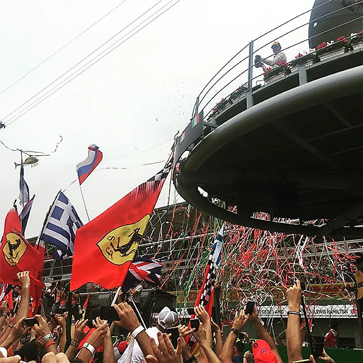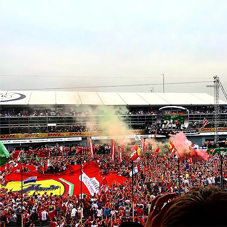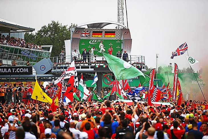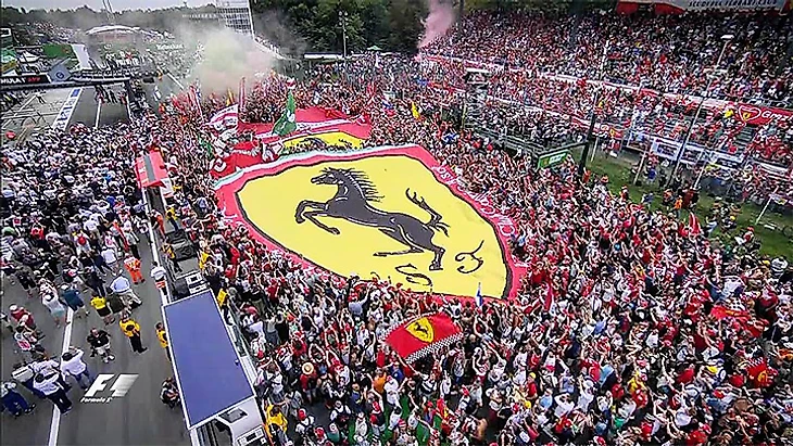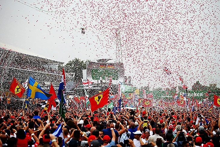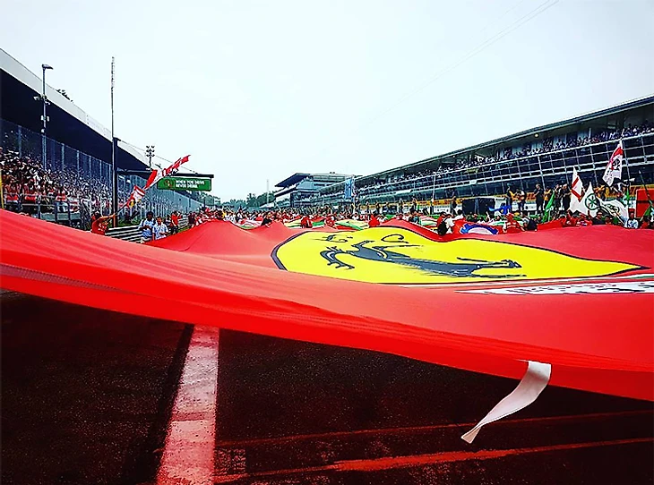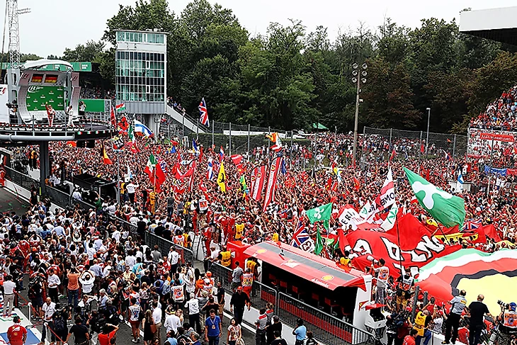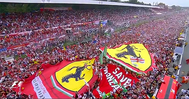 Разумеется, большинство людей на итальянской трассе – тифози, болельщики «Феррари». Они развернули множество флагов, среди которых выделяются огромные полотнища в виде сердца с эмблемой Скудерии.