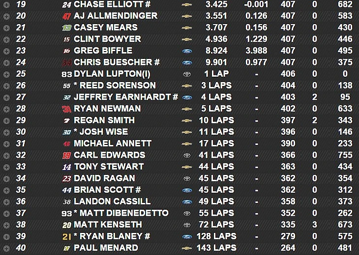 Касательно "погони", никаких перестановок не произошло. В борьбе за плей-офф все те же личности, что были и перед этим этапом. Более подробно мы поговорим о них уже после того, как закончится следующая гонка. Тем более, что плей-офф начался уже для гонщиков из Sprint Cup.