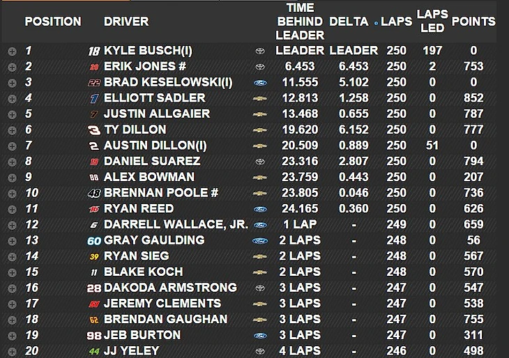 Всего два коушена, составившие, в общей сложности четырнадцать кругов из двухсот пятидесяти, которые включает в себя гонка. Кайл Буш пробыл в лидерах 197 кругов, 51 пришелся на Остина Диллона и парочку полидировал Эрик Джонс. Собственно, для Буша это уже восьмая победа в четырнадцати гонках сезона в серии Xfinity.