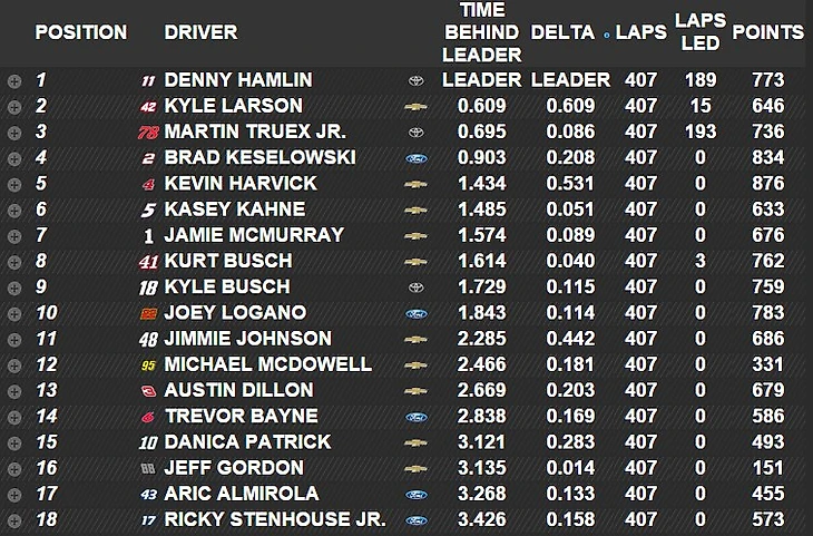 За два круга до финиша Рэган Смит, законтачивший со стеной вызвал уже шестнадцатый коушен, который стал рекордом для этой трассы. Соответственно, для выявления победителя потребовался овертайм. К гонке скоренько накинули еще четыре круга, а Хэмлин, четко среагировавший на рестарте довольно уверенно выиграл эту гонку. Борьбу за второе место выиграл Кайл Ларсон, третьим стал Труэкс, четвертым Кезеловски, а замкнул топ-5 Кевин Харвик.