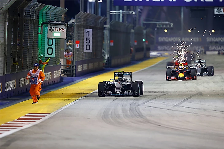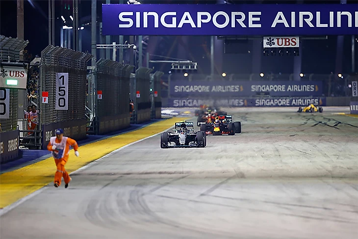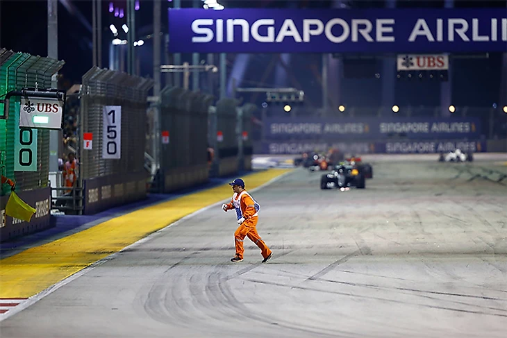 На первых кругах Гран-при Сингапура возникла очень опасная ситуация: после стартовой аварии и уборки обломков болида «Форс-Индии» Нико Хюлькенберга гоночная дирекция дала сигнал к рестарту, после чего автомобиль безопасности (за которым с медленной скоростью ехали болиды) покинул трек. Однако когда лидеры включились в борьбу, перед ними на дорожном полотне неожиданно возник сотрудник автодрома. К счастью, маршал, участвовавший в уборке обломков, успел убежать от автомобилей.