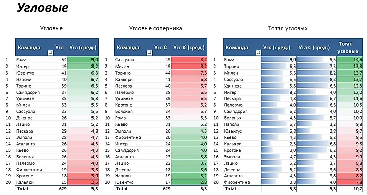 Обе команды в среднем подают больше 5,5 угловых. Возможен тотал больше 9,5 и победа Наполи по угловым