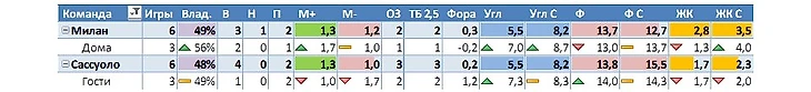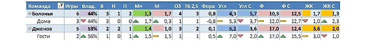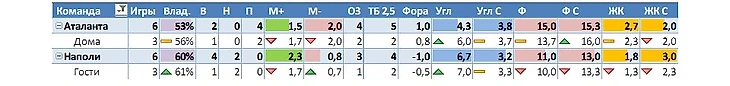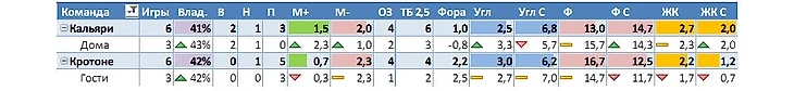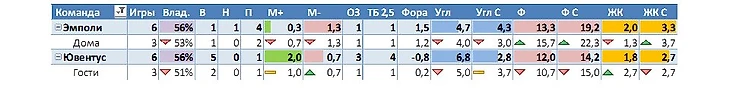 Поясню, что в основной строке напротив названия команды будет информация по всем 6 турам в целом, а ниже по тем играм, которые хозяева предстоящего матча проводили дома, а гости, соответственно, на выезде.