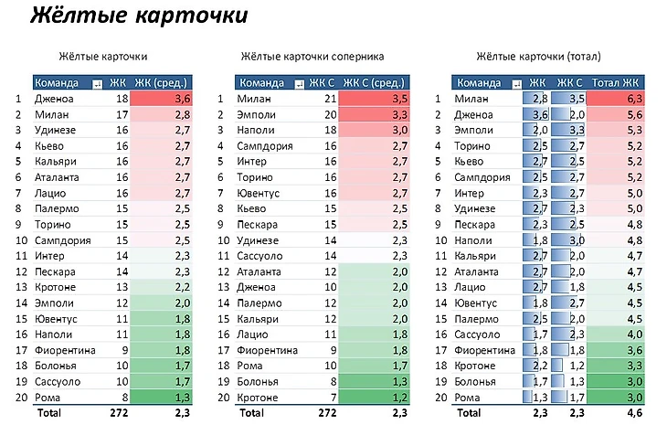 Соперники Эмполи фолили в среднем 22,3 раза против 15,7 фолов команды в первых 3 её домашних матчах. Отрицательная статистика и по ЖК: 1,3 у хозяев и 3,7 у гостей. В 3 гостевых встречах Юве среднее количество ЖК 2,7 - 2,7. В этом матче возможна победа Ювентуса по ЖК.