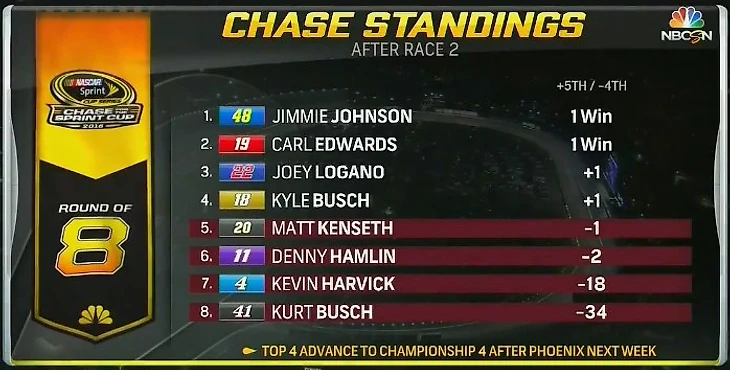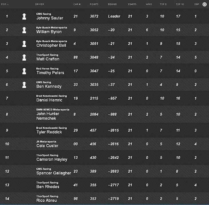 Таким образом Сотер укрепился в качестве лидера чемпионата, опережая Уильяма Байрона уже на двадцать очков. К слову, Байрон, который занял в гонке шестое место может быть спокоен за свое место в финале. Учитывая его потрясающую стабильность (Байрон за пять гонок "чейза" пять раз финишировал в топ-10), место в финальной четверке ему обеспечено. Правда то, как Сотер проводит гонки, начиная, пожалуй, с августа, ставит под сомнение однозначную победу Байрона в чемпионате.