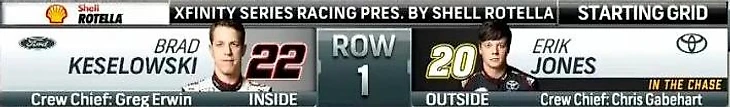 Так вот, квалификацию выиграл еще один представитель Sprint Cup - Брэд Кезеловски. Разделит с ним первую линию стартового поля Эрик Джонс, для которого весь "чейз" пока складывается из рук вон плохо. Новичок серии стал лучшим в "регулярке", но плей-офф пока не задался. Что интересно, Эрик в этой гонке выступит с ливреей, посвященной игре Call of Duty infinite warfare. Лидеры сезона, Суарез и Сэдлер расположились на четвертой и восьмой позициях. Третье место в квалификации занял Мэтт Тиффт, который на полном расписании вообще нигде не выступает и перебивается случайными заездами, то тут, то там. Остальные "гости" расположились следующим образом - Кайл Ларсон - 5-й, Остин Диллон - 7-й, Кевин Харвик - 9-й, Мэтт ДиБенедетто - 22-й.