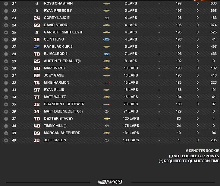 Кстати, интересный момент. В NASCAR резко ограничили "гостей". Дело в том, что гостевых для серии пилотов в CWTS было трое. Вообще-то их было пятеро, но двое не прошли квалификацию. Начиная со следующего сезона, пилот с 5 сезонами Кубка за плечами сможет принять участие лишь в 10 гонках Xfinity и 7 гонках CampingWorldTruck. Помимо этого им будет запрещено участвовать в этапах Чейза и Dash4Cash. А в финалах сезона обеих серий будет запрещено участвовать любому пилоту, набирающему очки в Кубке. Таким образом, Кайл Буш, например, который уже на данном этапе серии Xfinity провел 16 из 30 гонок не сможет "задавить авторитетом" местных гонщиков. Ну а в этой гонке "гостевым" пилотам досталось пятое, восьмое и двадцать четвертое места, которые заняли Даниэль Суарез, Остин Диллон и Рид Соренсон соответственно.