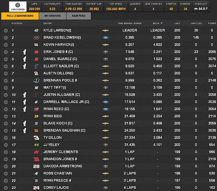 Эрик Джонс выиграл старт, а вот Брэд Кезеловски в какой-то момент откатился аж на пятую позицию, но к девятому кругу уже был на третьем месте, наседая на Суареза. На девятом круге развернуло Хайтауэра и судьи вывесили желтые флаги. К тридцатому кругу Кезеловски захватил лидерство, а прелседовал его уже не Джонс, оказаавшийся на третьем месте, а Ларсон. В пятерке кроме них были Остин Диллон и Кевин Харвик. Заезд начал напоминать Sprint Cup.