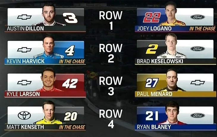 Самое интересное началось под конец гонки, когда время подходило к концу, а пилоты ставили уже окончательные времена. Пока "чейсеры" боролись между собой и их разбавляли другие гонщики, Остин Диллон успел поставить круг, который оказался недосягаем ни для Логано, который уступил Остину шесть тысячных секунды, ни Кевину Харвику, который проиграл одну сотую секунды Логано. Диллон явно чувствовал себя отлично в субботу. Видно, что он нашел оптимальные настройки, которые позволят побороться за победу. Проблема для Диллона только в том, что соперники остатали ну уж слишком мало и первые девять гонщиков уместились в двух десятых секунды.