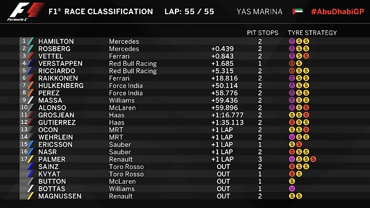 1-Росберг(5) 2-Хэмильтон(5) 3-Риккиярдо 4-Феттель(5) 5-Ферстапен(5) 6-Райкконен(10) 7-Масса 8-Боттас 9-Перес(5) 10-Хюлькенберг