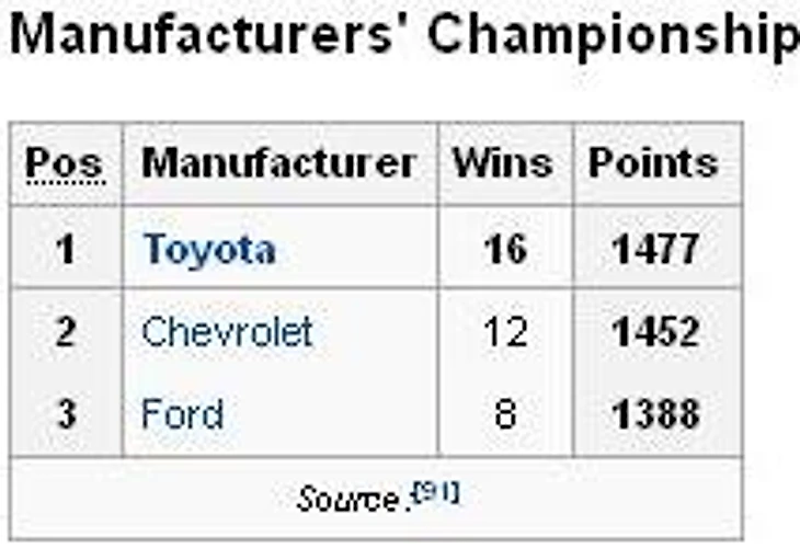 Тойота в этом сезоне была представлена всего семью машинами, причем две из них вообще ни за что не боролись. И вот, пять машин Камри умудрились вытащить на себе чемпионат производителей. Шевроле представил девятнадцать машин у разных команд и одержал двенадцать побед как производитель. Ладно, там тоже не все бились за победы, но все же, пятерка Тойот умудрилась выиграть шестнадцать гонок. Восемь побед отошло Форду. Таким образом - Тойота - сильнейший производитель всех трех элитных дивизионов.