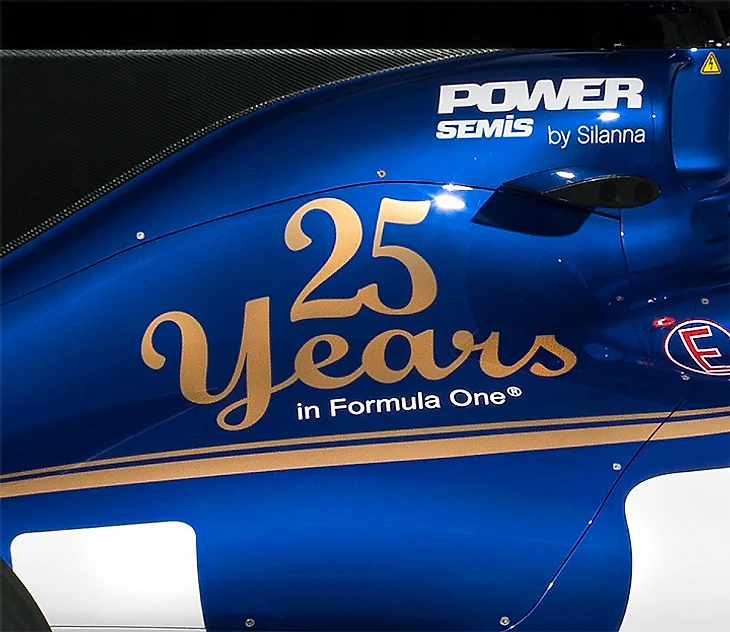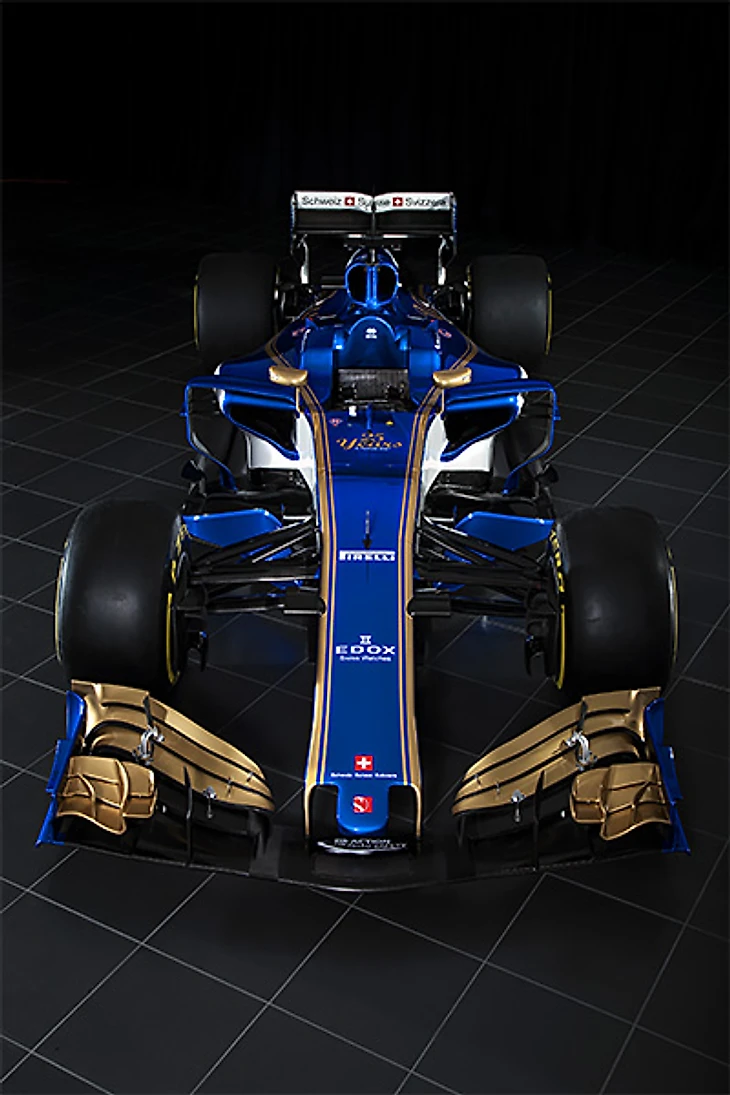 Цветовой дизайн в общих чертах остался прежним, однако на этот раз заметно, что хинвильцы не просто облили автомобиль разными красками, а по-настоящему потрудились над тем, чтобы техника выглядела достойно: синий цвет стал более глубоким и насыщенным, желтый уступил позолоте (не забываем про важную дату), а белые вставки разбавляют однотонность и словно намекают потенциальным спонсорам — впишите сюда название своего бренда! Пожалуй, это лучшая расцветка «Заубера» за последние лет десять.