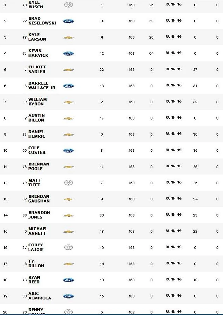 Вот топ-20 прошедшей гонки Rinnai 250. Половина гонщиков - участники Monster Сup. Одно радует, парней ограничили в возможности участвовать неограниченное количество раз. А то ведь реально гонки серии становятся похожи на тренировки. Гонщики из "высшего дивизиона" не особо стремятся рисковать в Xfinity. Поэтому гонка запомнилась в первую очередь тем, что начинающий комментатор - Чейз Эллиотт рассказал, как дети, которых опекает фонд имени гонщика, стали дизайнерами его гоночной обуви. Это событие действительно было интереснее того, что происходило на трассе.