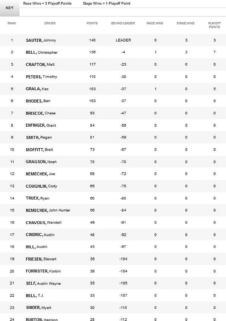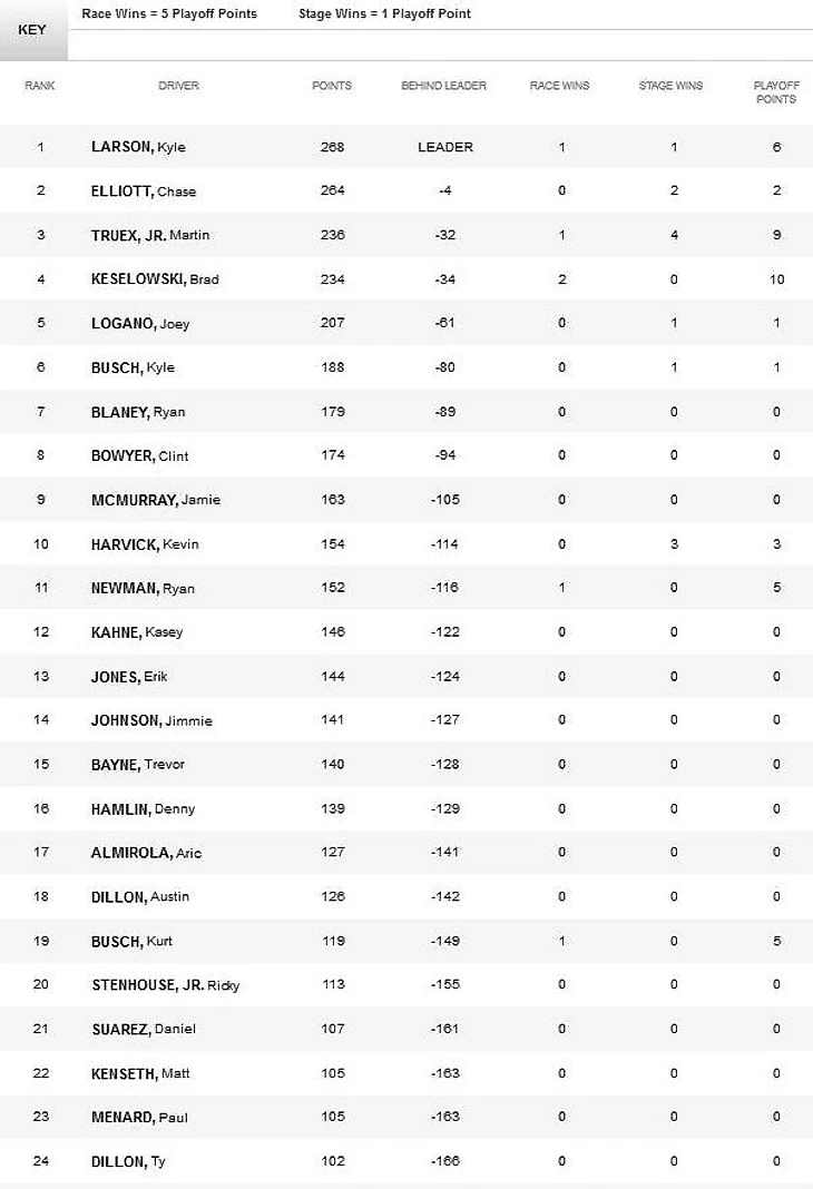 Таким образом Кезеловски прервал красиво намечавшуюся тенденцию, когда каждую следующую гонку выигрывал другой гонщик. Брэд стал первым гонщиком одержавшим две победы в сезоне, тем более, для этого ему понадобилось всего шесть гонок. Лидерство в чемпионате сохранил Кайл Ларсон, но если в следующей гонке он финиширует за спиной Чейза Эллиотта, при условии, что оба гонщика будут в топ-10, то Чейз выйдет на первое место в чемпионате, не имея ни одной победы в активе. Но это все размышления для будущей гонки. Тем более, что и оштрафованный Брэд Кезеловски не так далеко от пары лидеров. Он уступает находящемуся на третьей позиции Мартину Труэксу всего два балла. Пятерку лидеров чемпионата замыкает Логано, на счету которого 207 очков. Кстати, на шестую позицию вырвался Кайл Буш.
