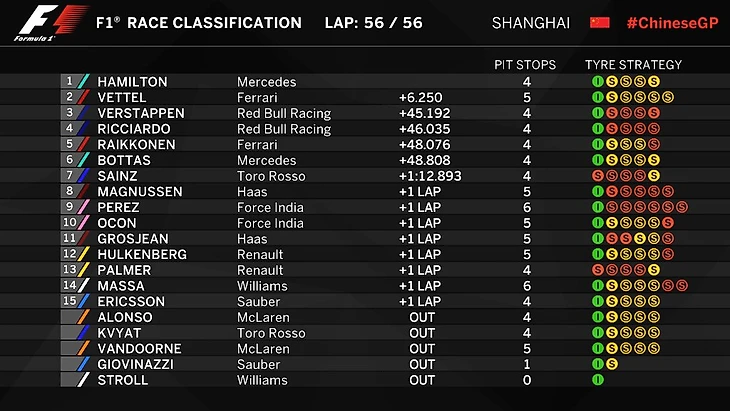 ПК - Феттель ЛК - Феттель НП - Палмер 1 – Феттель(5) 2 – Хэмилтон(5) 3 - Райконен 4 - Боттас 5 – Рикардо(5) 6 - Ферстапен 7 - Масса 8 - Хюлькенберг 9 - Квят 10 - Сайнс