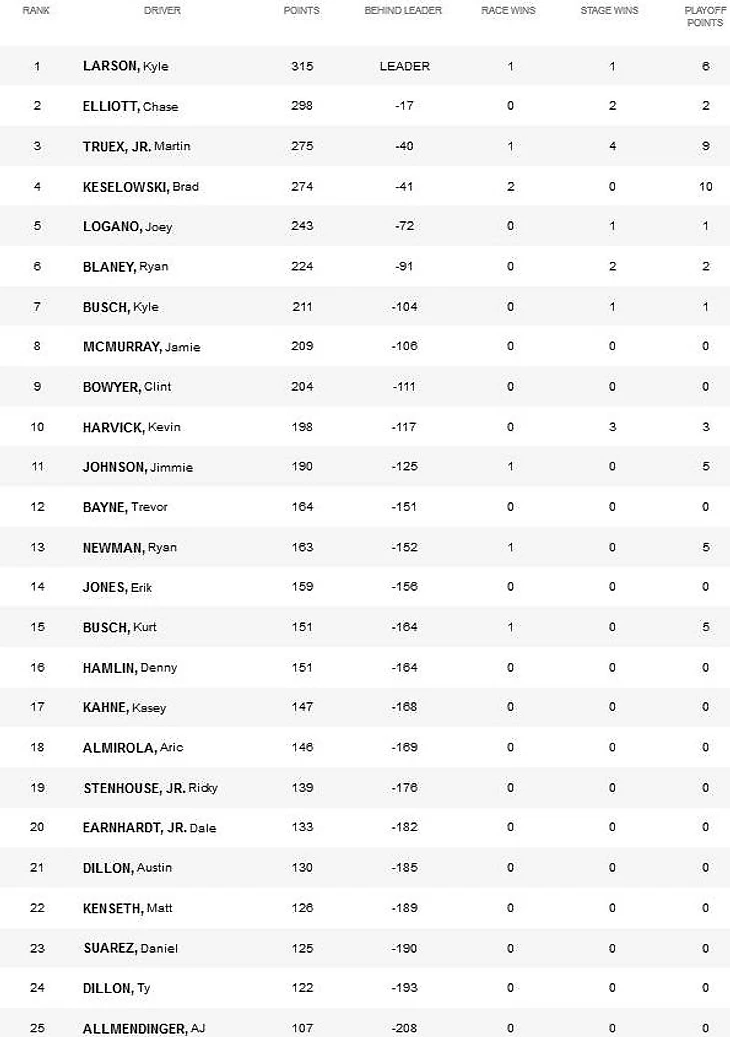 Вот, кстати, у Ларсона снова вторая позиция. Их правда пока четыре, а не шесть, но такими темпами Кайл Мията явно может войти в историю. После семи этапов Ларсон разменял триста баллов, их у него уже 315. Шесть дополнительных у него набрано в плей-офф. Чейз Эллиотт, который является главным преследователем Кайла Ларсона выступил несколько слабее, оказавшись в конце топ-10, на девятой позиции. Чейз, вместе с Дэйлом Эрнхардтом стартовали из самой задницы пелетона, и оба выступили вполне достойно. Причем Дэйл наконец-то въехал в топ-10, а то казалось, что он все больше похож на Джеффри, который и сам не сильно-то Эрнхардт, скорее по фамилии только, да и техника у него слабая. Джеффри, кстати, вылетел, но кого это интересует?