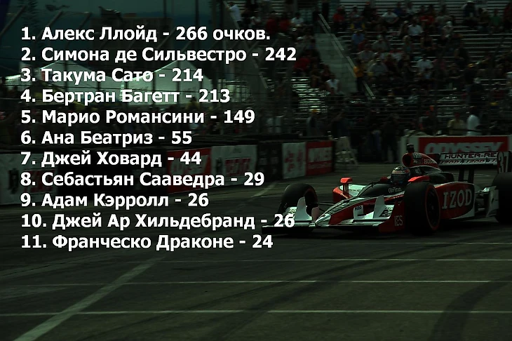 Итак, лучшим новичком сезона стал британец Алекс Ллойд, для которого этот год стал лебединой песней. Алекс до этого трижды стартовал в серии. Два раза он выходил на старт в Инди-500 и один раз в Хоумстеде, на закрытии сезона. В 2011-м году Ллойд провел еще один сезон за команду Дэйла Койна. В 2014-м мелькнул в серии GT, а потом, по слухам, занялся журналистикой. В общем зачете лучший среди новичков оказался лишь шестнадцатым.