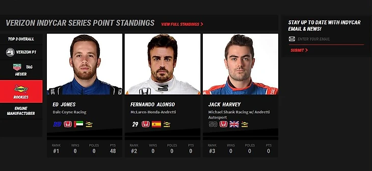 На данный момент из новичков, которые выступают на полном расписании находится только Эд Джонс. Еще один выходец из IndyLight - Зак Веач заменит Хильдебранда в Алабаме, а также примет участие в Инди-500. Также два гонщика-дебютанта будут представлять команду Андретти. В тандеме с Майклом Шэнком Андретти выставит автомобиль #50 для Джека Харви, а с Маклареном выступит под #29 испанец Фернандо Алонсо. Понятно, что Алонсо не выиграет звание новичка года, ибо Джонсу, чтобы проиграть, надо срочно завершить карьеру, но в отличие от Вотье, Джонс хотя бы показывает приличный уровень и не просто так носит звание чемпиона подэлитной серии. Зато Фернандо Алонсо вполне по силам стать вторым в зачете новичков. Понятно, что это достижение не дает никаких дополнительных бонусов, но выглядит вполне симпатично.