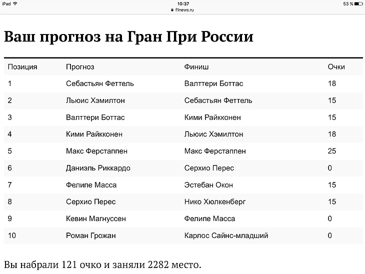 Гонка, по словам Себастьяна Феттеля, была проиграна на старте. Вполне возможно, но надо отдать должное Скудерии, что они пытались переломить ход гонки за счет тактики, и у них это почти получилось. Вероятно, идеальным вариантом была бы остановка Себа на 2-3 круга ранее. Кими Райкконен хорошо выступил в Сочи, чуть-чуть уступив напарнику в квалификации и в гонке. Борьба за Кубок конструкторов теперь в пользу Мерседеса, но разница всего в 1 очко...
