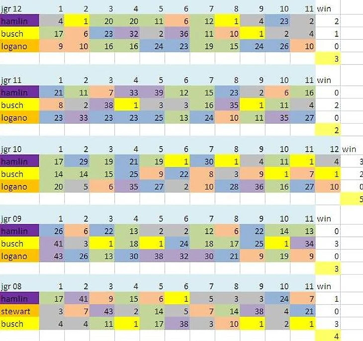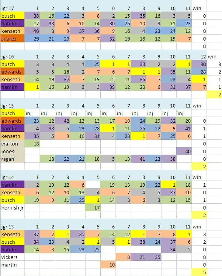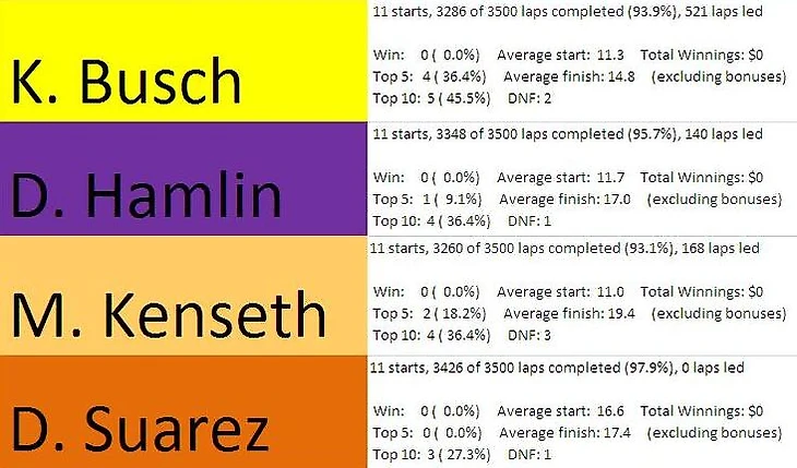 Сразу пояснения для тех, кто в танке: четырьмя машинами "Джо Гиббс Рэйсинг" стали выступать только с сезона 2015, до этого у них было три машины на полном расписании, а четвертая машина выставлялась на отдельные заезды. Именно поэтому я не стал включать в таблицу гонщиков, которые выступали на отдельных этапах. Тем не менее, если "чартер" команды является основным (на данный момент это #11, 18, 19, 20), то заменяющий гонщик уже попадал в таблицу. Также, в двух случаях, "Гонка Звезд" проходила после двенадцати этапов чемпионата, а не одиннадцати. Учитывая взятое мною дробление сезона по событиям, данные заезды также были включены в статистику. Конечно, они сыграли свою роль, ведь в прошлом году Мэтт Кенсетт выиграл гонку в Довере, которая проходила перед уик-эндом звезд серии, а в 2010 году победил Кайл Буш, но обе этих победы не повлияли коренным образом на общую картину.