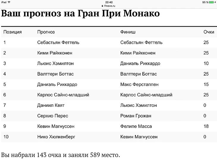 Впервые с той самой Германии'2010 Скудерия взяла дубль. Как уже было сказано, на мой взгляд, командной тактики в Монако не было. Все по делу: Себ выдал великолепную серию кругов, а Кими, к огромному сожалению, потерял победу. Безусловно, триумф финна был более ожидаем и желанен, чем четырехкратного чемпиона, потому как эти успехи у скандинава, к несчастью, крайне редки. Посмотрим в Монреале, как повлияет на Райкконена эта ситуация.