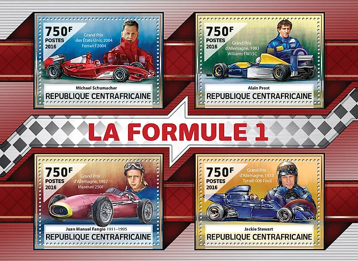 А теперь немного экзотики. Где только ни выпускают марки, связанные с «Формулой-1»! Например, взять прошлогоднее издание почтовой продукции Центральноафриканской Республики. Вот с одной стороны сомневаешься, если ли у них в стране вообще телевизор, интернет и демократия, а с другой стороны — у них в наличии красивые марки с Шумахером, Простом, Стюартом и Фанхио. А у нас – нет.